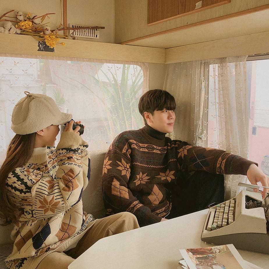 2 Colors Couple Sweater Winter Snowflake Print O-neck Loose Knitwear Retro Unisex Pullover