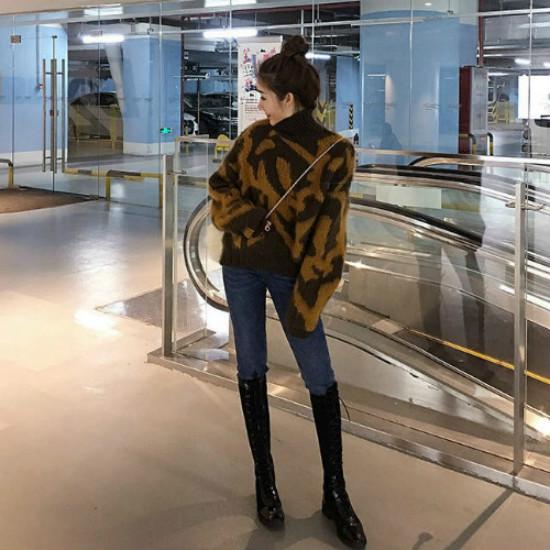2 Colors Sexy Lady Turtleneck Leopard Sweater Knitwear Loose Pullover Jumper Short Top