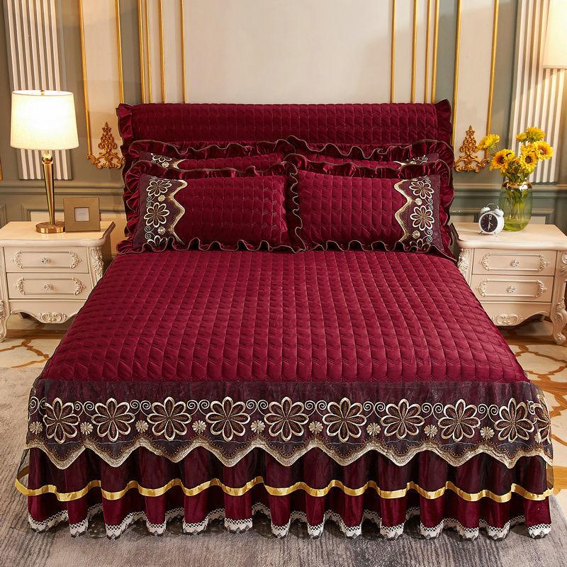 3pcs/set Crystal Velvet Bed Skirt and Pillowcase Three-piece Quilted Thick Velvet Lace Bedspread Winter Warm Short Plush Non-slip Bed Cover