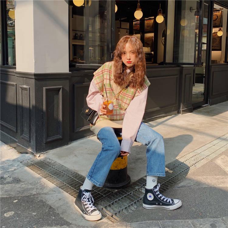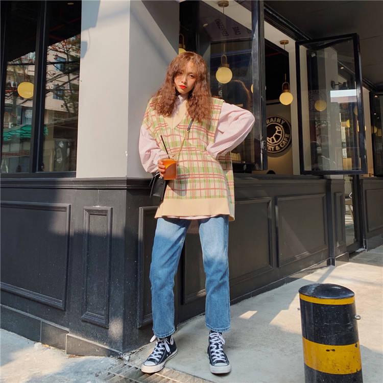 Autumn and Winter Check V-neck Sweater Vest Girls Loose Knitted Sleeveless Sweater