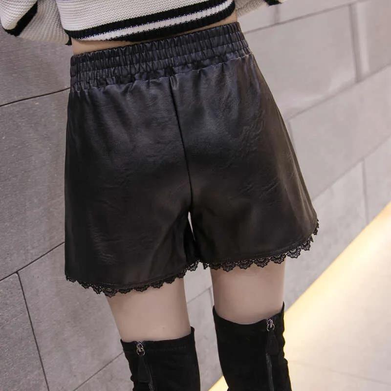 Autumn and Winter Pu Leather Shorts Women's Elastic Waist Large Size Loose Wide-leg Pants Lace Edge Bottoming A-line Boots Pants