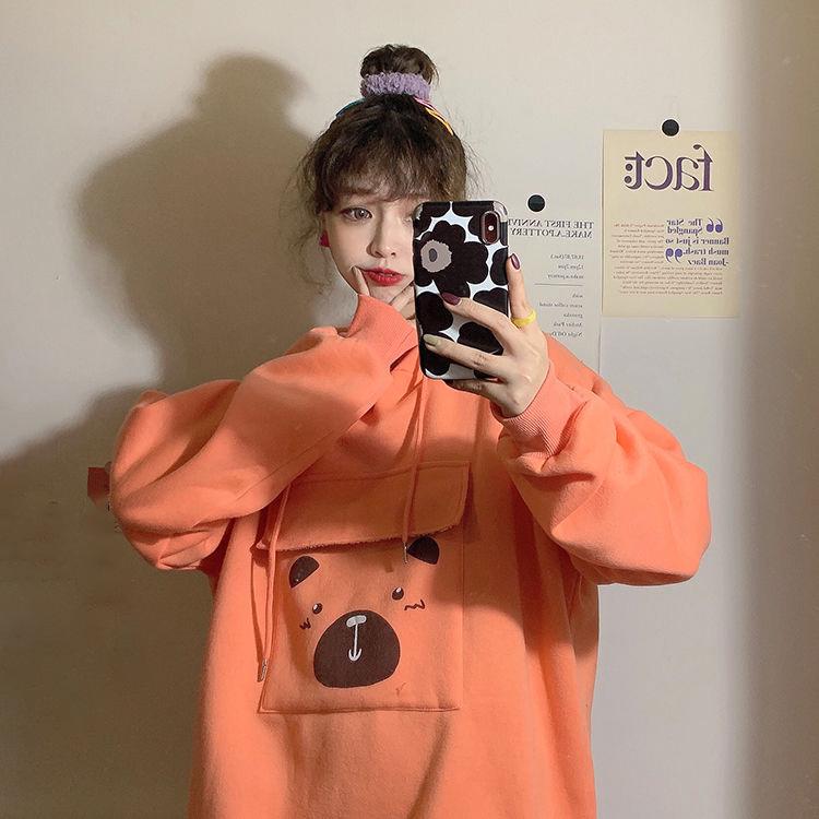 Autumn and Winter Thickened Student Jacket Women's Loose Hooded Big Pocket Blouse Mid-length Sweater