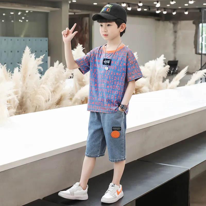 Children's Clothing Boys Summer Suit Head-up Letter Printing Short-sleeved Breathable Denim Five-point Pants Cool Cute Boy Two-piece Suit