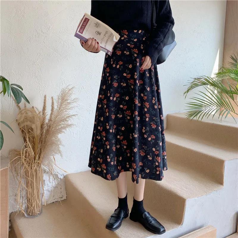 Corduroy Skirt Female Autumn and Winter Long Floral A-line Skirt Ins Super Fairy Thin Student Loose Long Skirt
