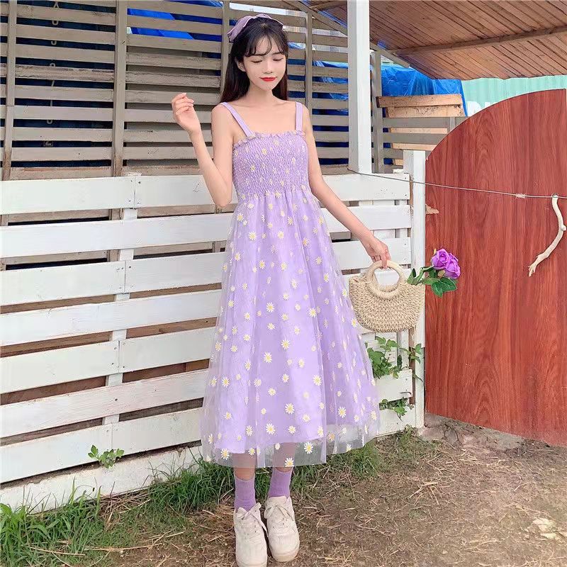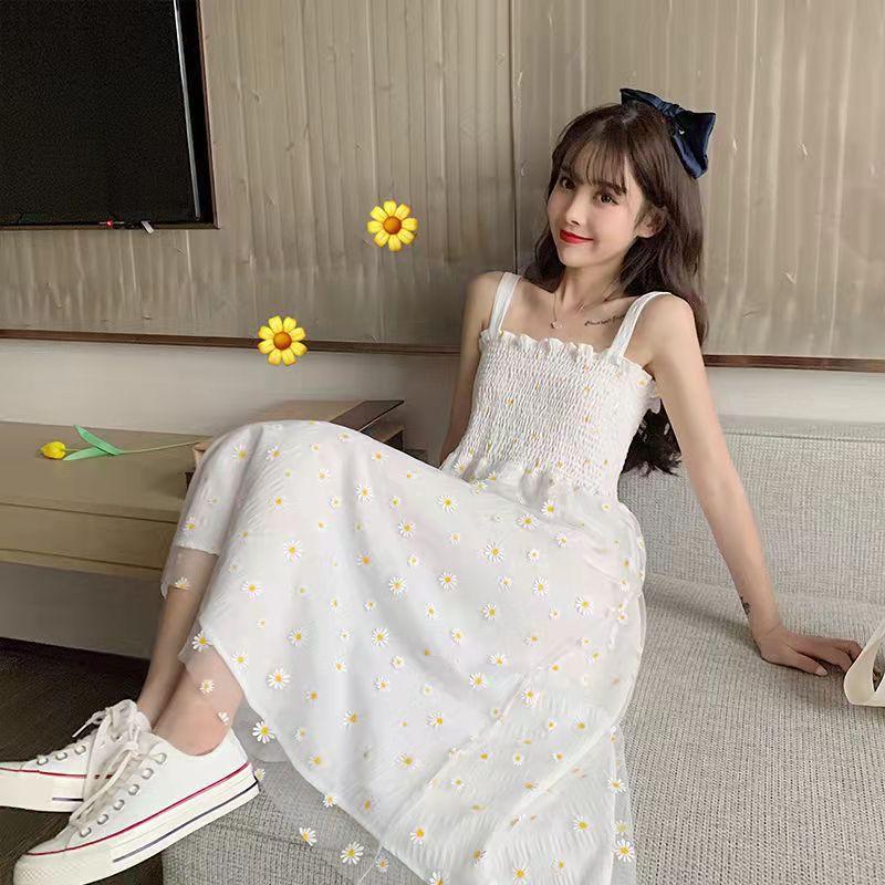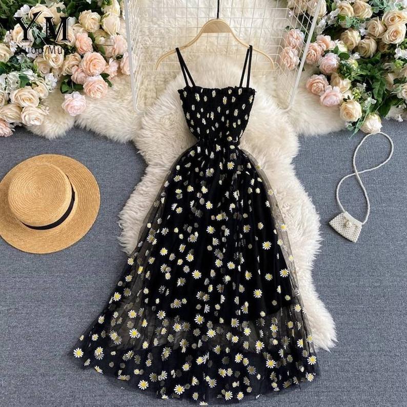 Daisy Mesh Yarn Spaghetti Strap Dress Women Summer French Style Pleated Slim Wasit Retro Sweet Dresses