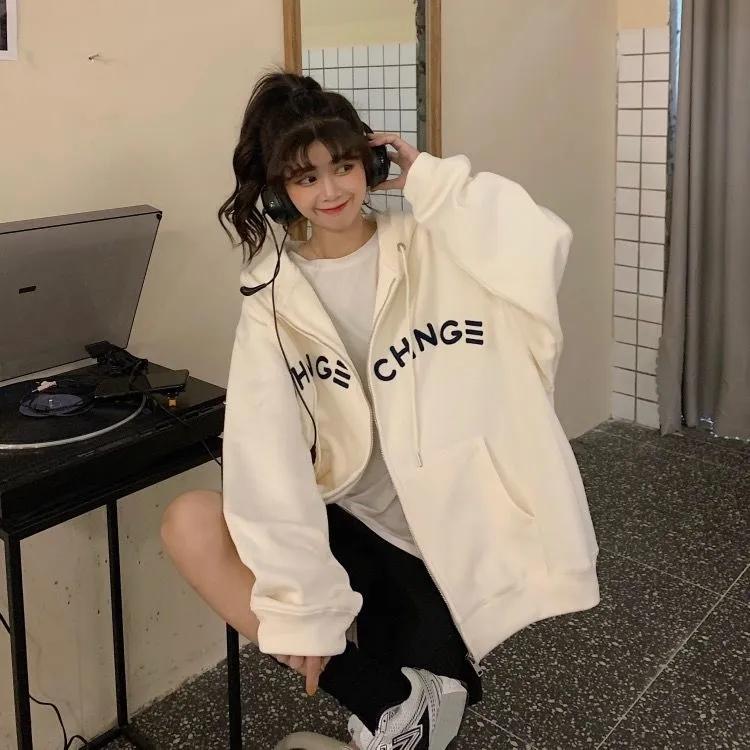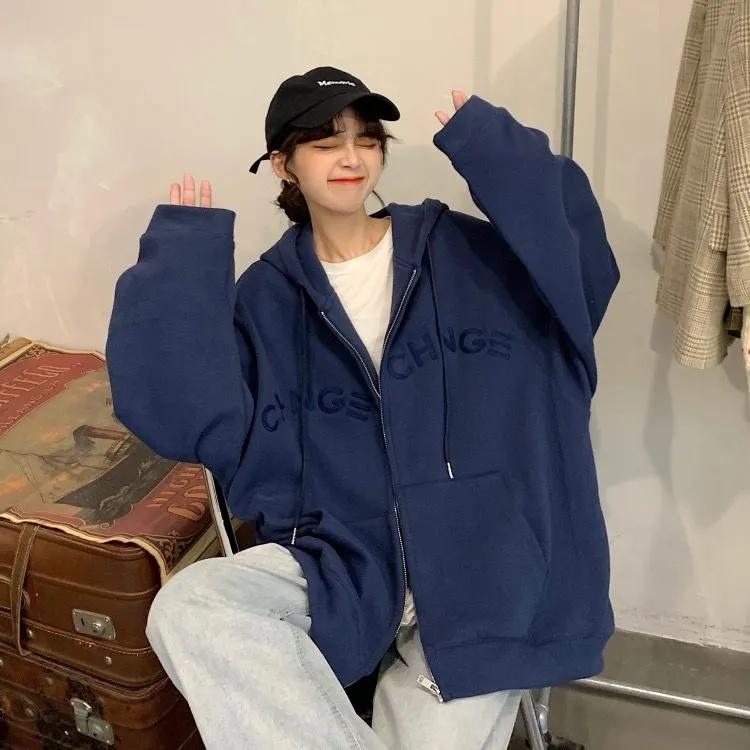 Embroidered Solid Color Sweater Coat Women Autumn and Winter Loose Hooded Cardigan Large Size Sweater Girl's Zipper Jacket