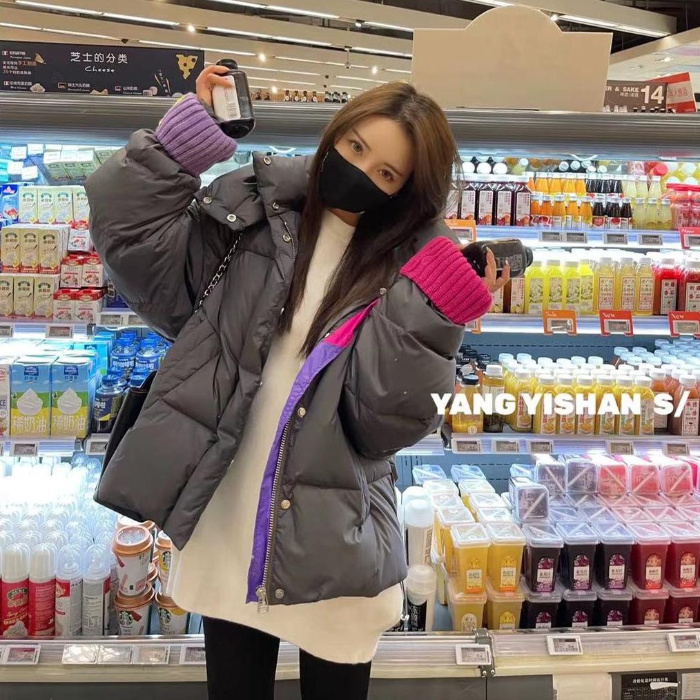 European Goods C Letter Knitted Cuffs Bread Down Jacket Women Winter Short White Duck Down Hooded Thick Loose Jacket