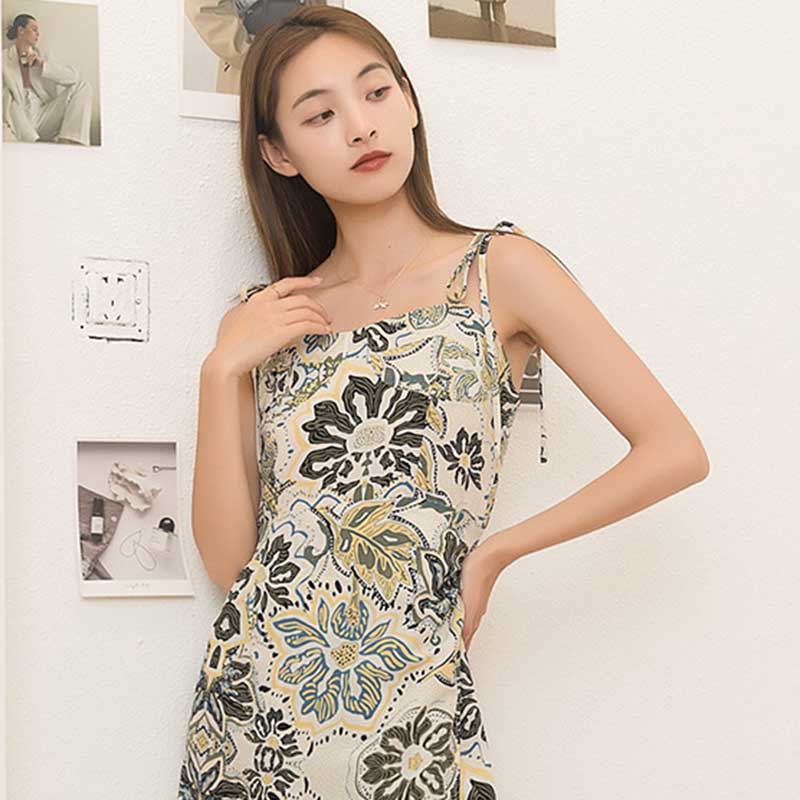 French Sling Dress Summer Dress Print Women's Loose Slim Square Neck Mid Length Skirt