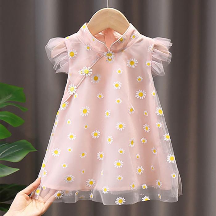 Girls' Skirt Summer Children's Princess Skirt Cheongsam Children's Mesh Ruffle Dress Ethnic Style Daisy Cheongsam Baby Girl Dress