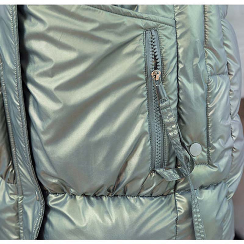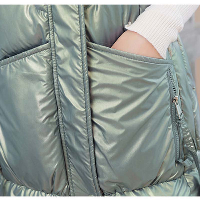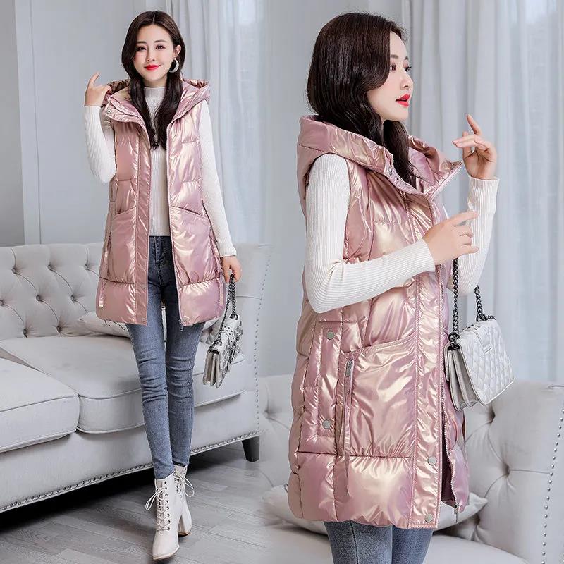 Glossy Disposable Down Cotton Vest Women's Mid-length Autumn and Winter Thick Padded Coat Vest Loose Hooded Waistcoat