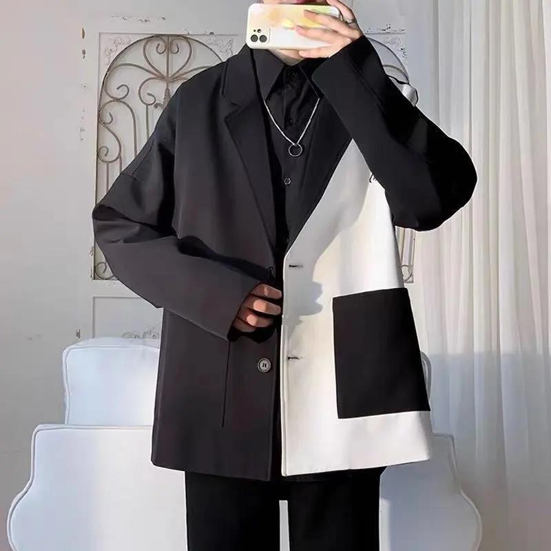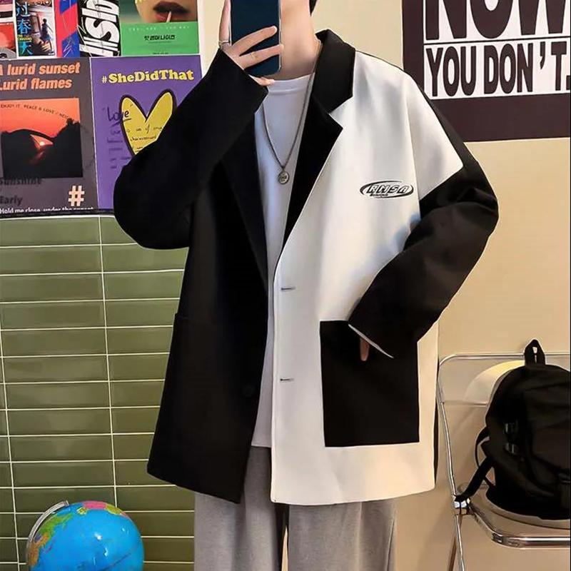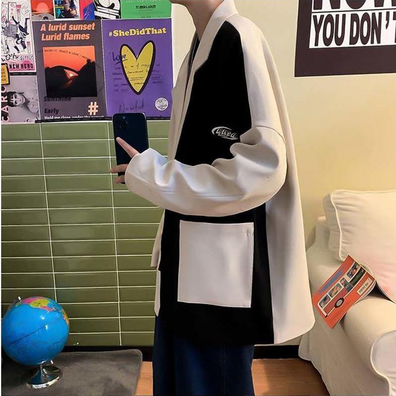 High-quality Contrast Color Stitching British Style Suit Men's Autumn Casual Loose Suit Jacket Long-sleeved Warm Mid-length Windbreaker