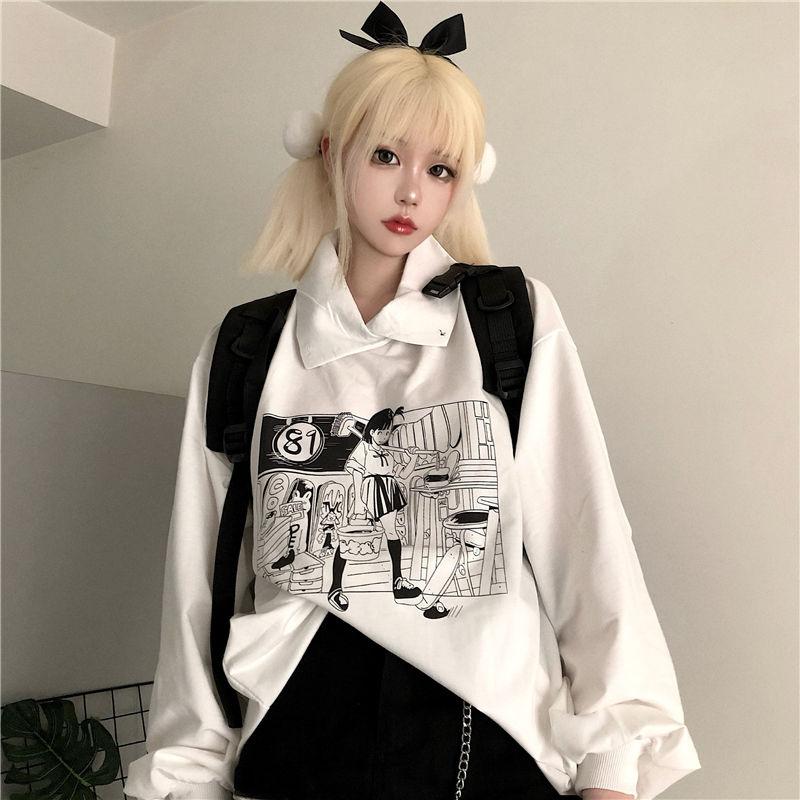 Hoodies Women Japanese Anime Pullover Sweatshirts Oversized Streetwear Harajuku Long Sleeve Turtleneck Hoodies Autumn Winter Fashion White Tops