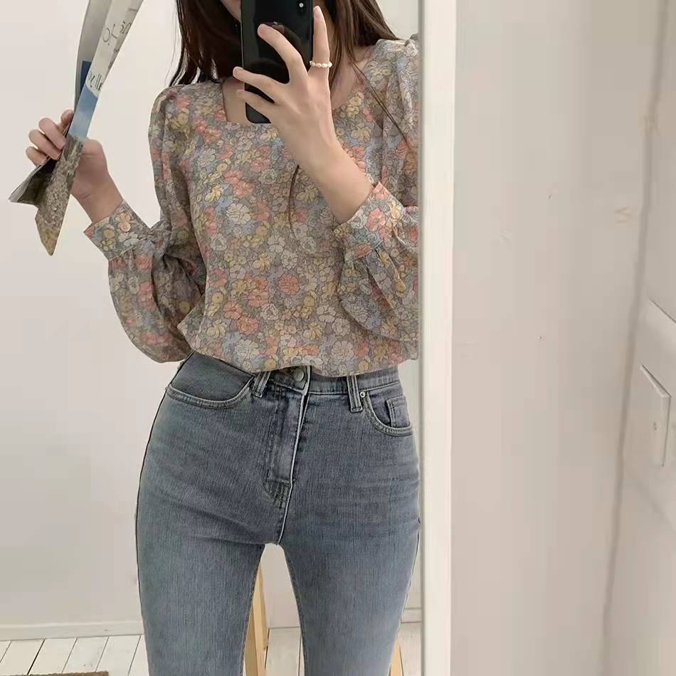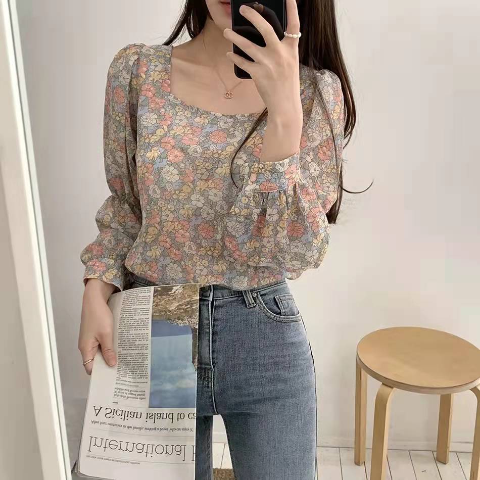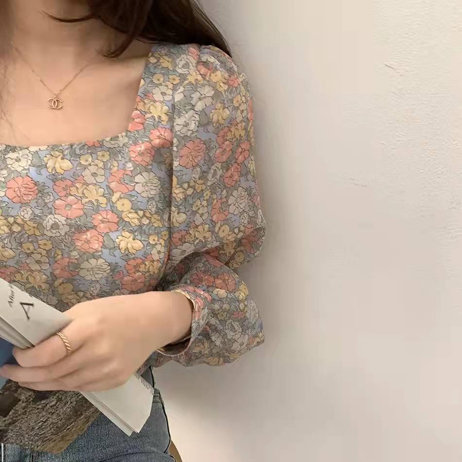 Korean Vitality Girl Autumn Sweet Age Reduction Floral Retro Square Collar Long-sleeved Shirt Loose Chiffon Top