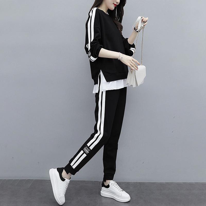 Large Size Thin Sports Suit Female Casual Two-piece Round Neck Long-sleeved Shirt + Casual Sports Pants Loose and Comfortable