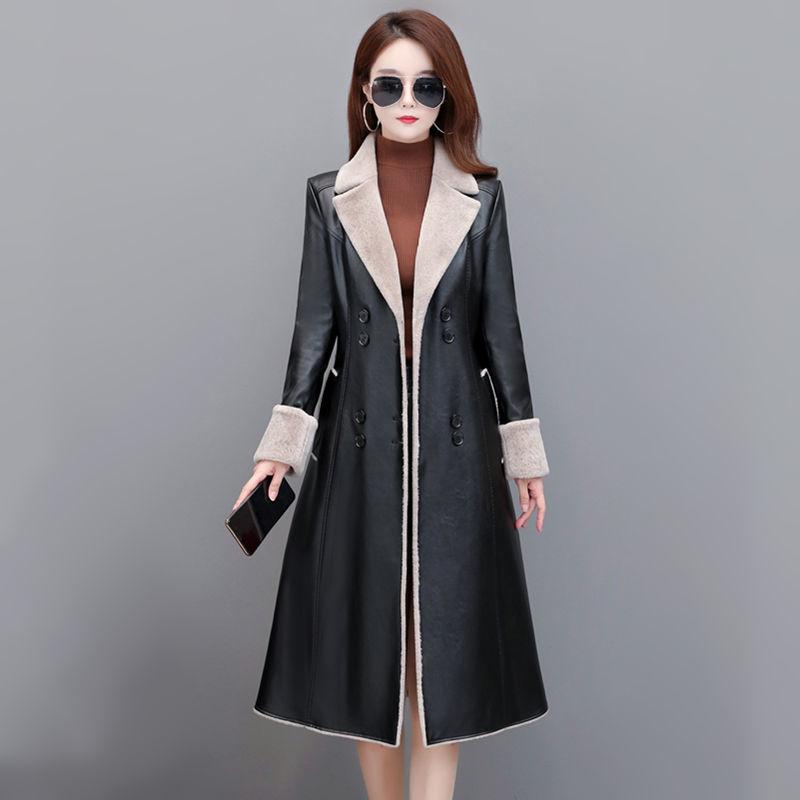 Leather Trench Coat Winter Long Sheepskin Coat Women Plus Velvet Thick Warm Leather Coat Black Overcoat with Faux Fur Inside