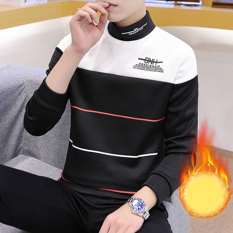 Long-sleeved T-shirt Winter Plus Velvet Thick Stitching Mid-high Collar Sweater Men's Loose Bottoming Shirt Jacket