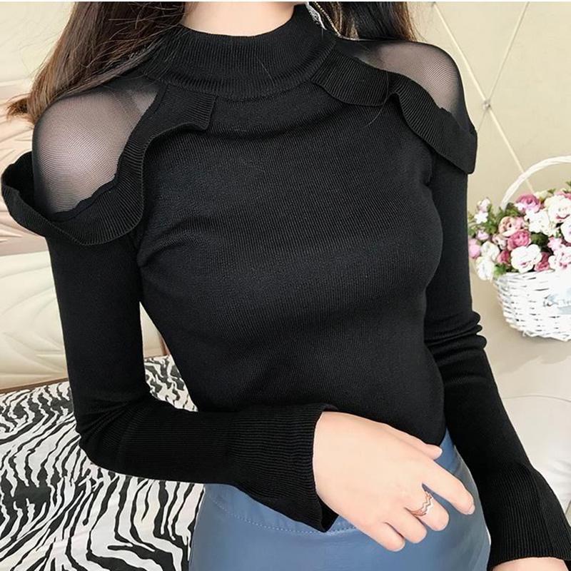 Mesh Stitching Half Turtleneck Top Long Sleeve Knit Pullover Sweater Slim Bottoming Shirt