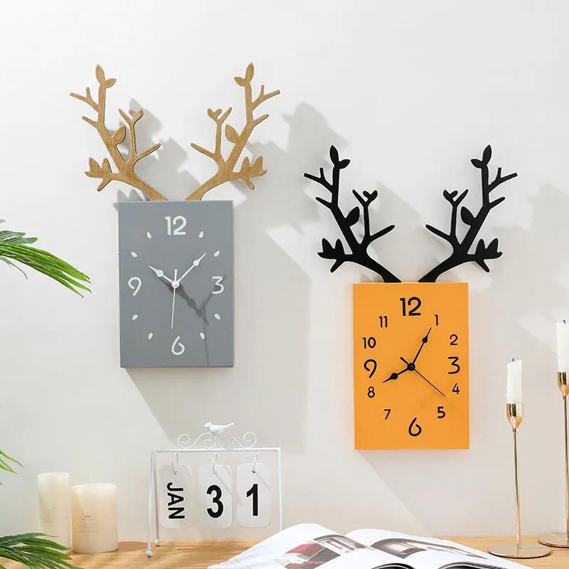Nordic Creative Antler Wall Clock Simple Solid Wood Clock Living Room Wall Hanging on The Wall Without Punching Household Silent Clock