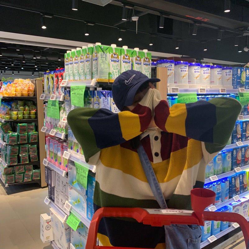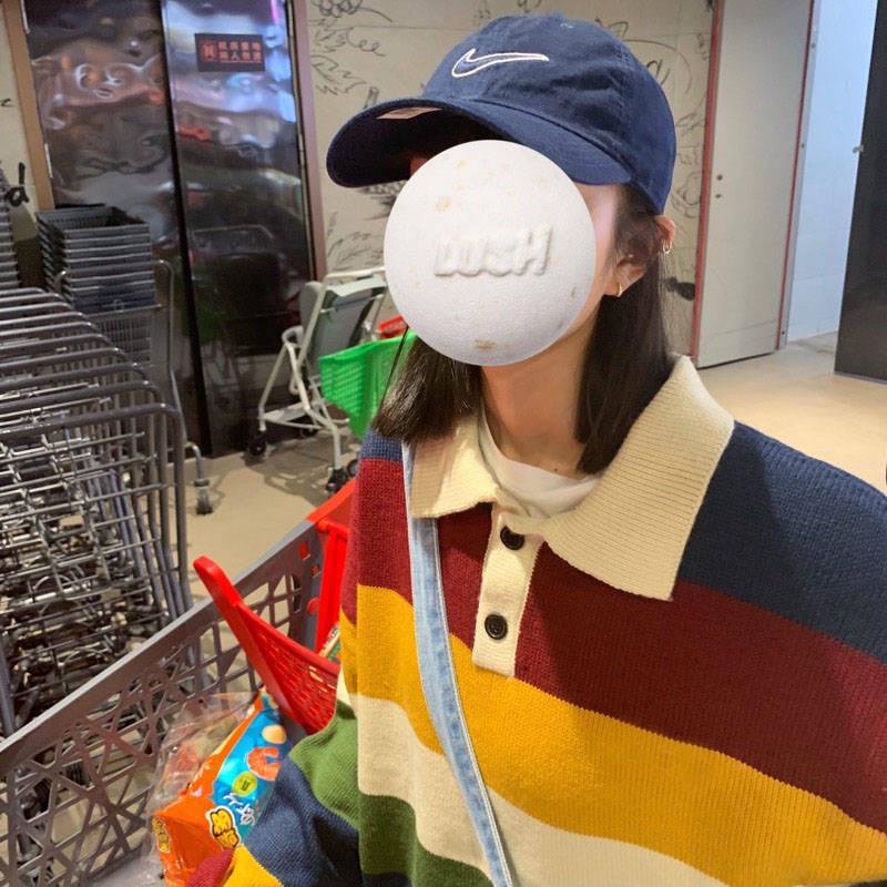 Pofulove Autumn Winter Harajuku Colorful Striped Sweater Female Loose Lazy Long-sleeved Sweater Coat