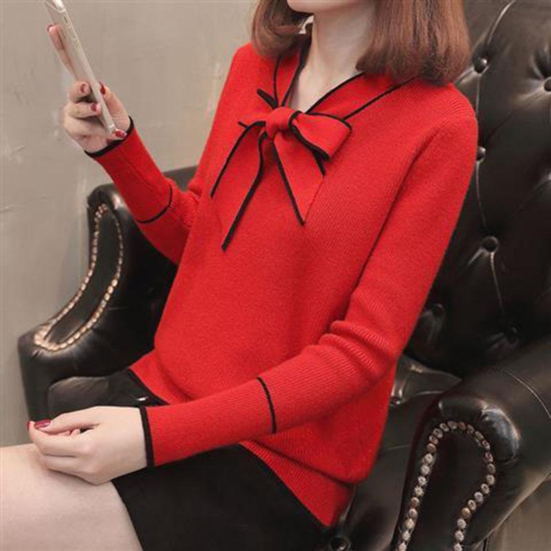 Pofulove Women Bow Decoration Casual Sweet Sweater V-Neck Long Sleeve Knitted Pullover Sweater