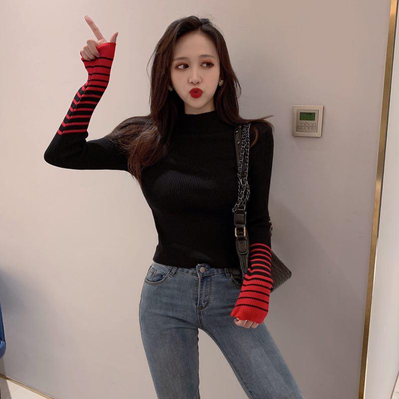 Pofulovestriped Tight Sweater Sweater Long Sleeves Net Red Color Matching Sweater Women's Retro