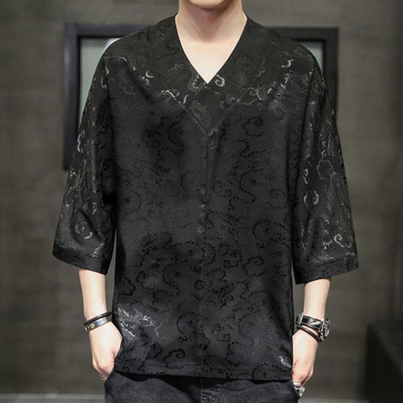 Short-sleeved Men's T-shirt Summer Large Size V-neck Ice Silk Three-quarter Sleeve T-shirt Men's Loose Half-sleeve
