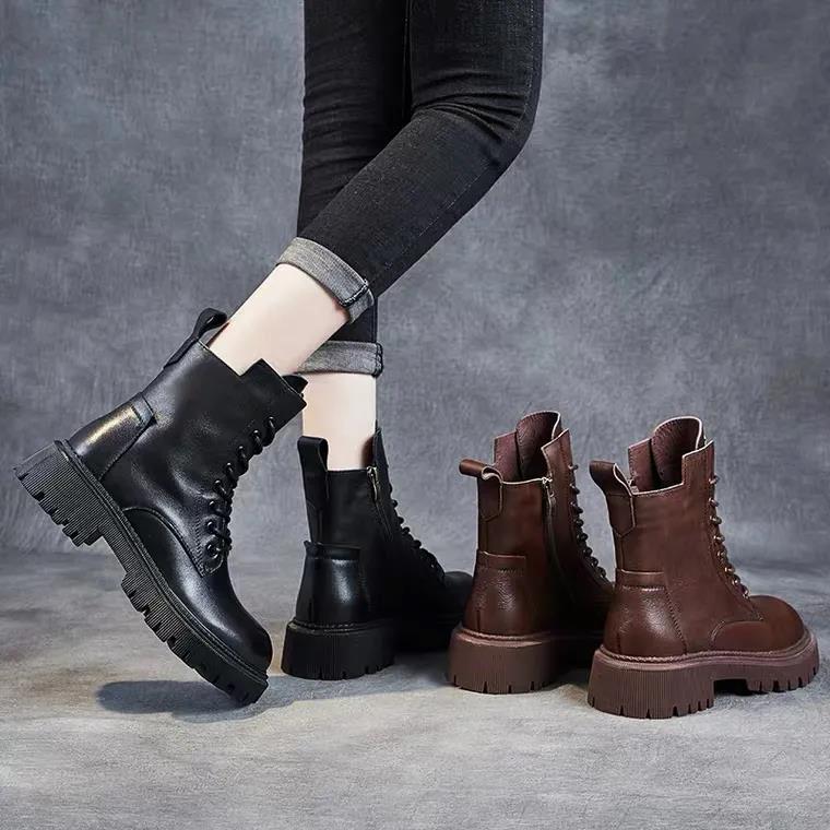Size35-40 Chunky Motorcycle Boots For Women Autumn 2021 Fashion Round Toe Lace-up Combat Boots Ladies Shoes