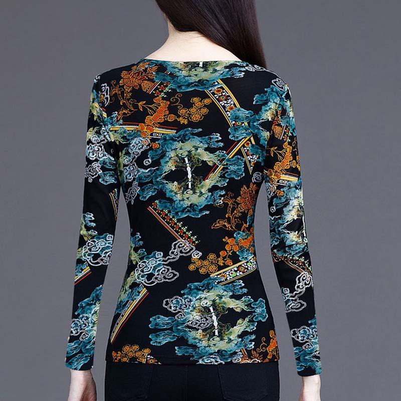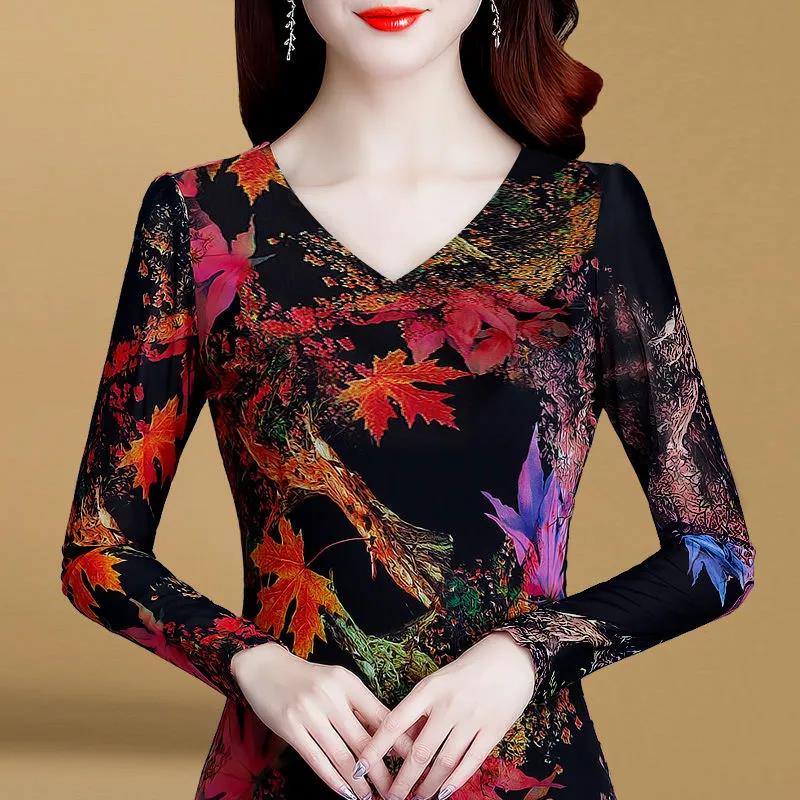 Spring and Autumn Printing Bottoming Shirt Women's Long-sleeved Mother T-shirt Thin V-neck Top Women