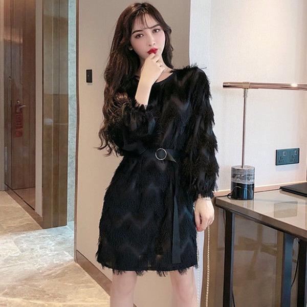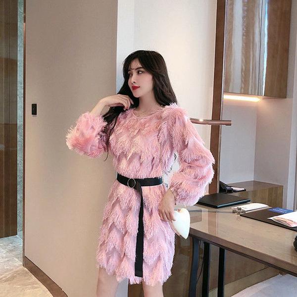 Spring and Autumn Sweet Round Neck Belt A-line Skirt Wavy Hairy Fringed Sweater Skirt Women
