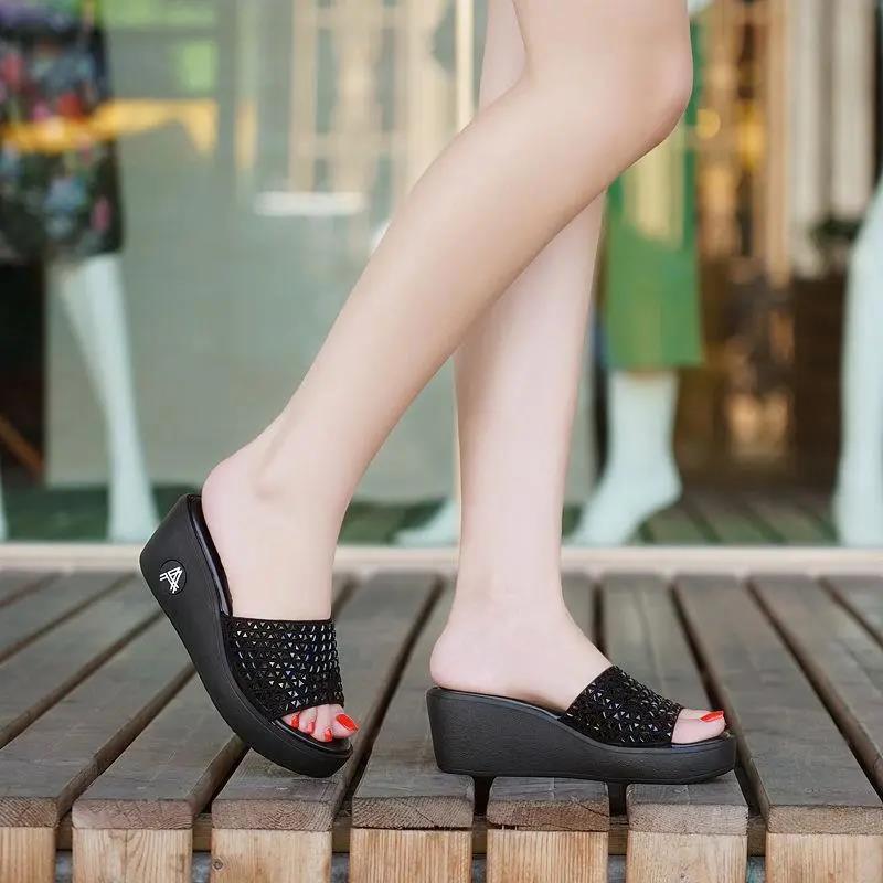 Wedge Heel Sandals and Slippers Ladies Outer Wear Muffin Platform High Heels Black Sequins Comfortable Thick Bottom Fish Mouth Slippers