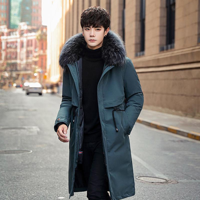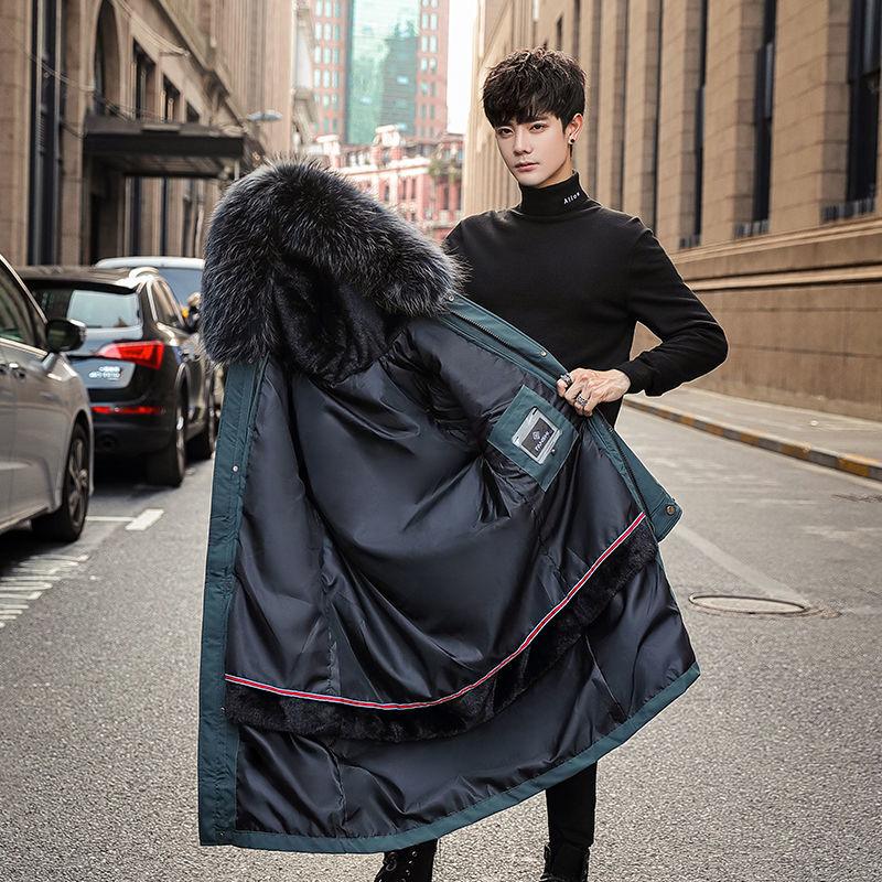 Winter Padded Jacket Men Plus Velvet Thick Mid-length Down Padded Jacket Korean Style Loose Hooded Big Fur Collar Padded Jacket Parka Coat