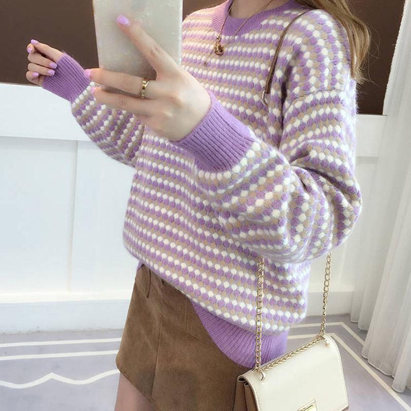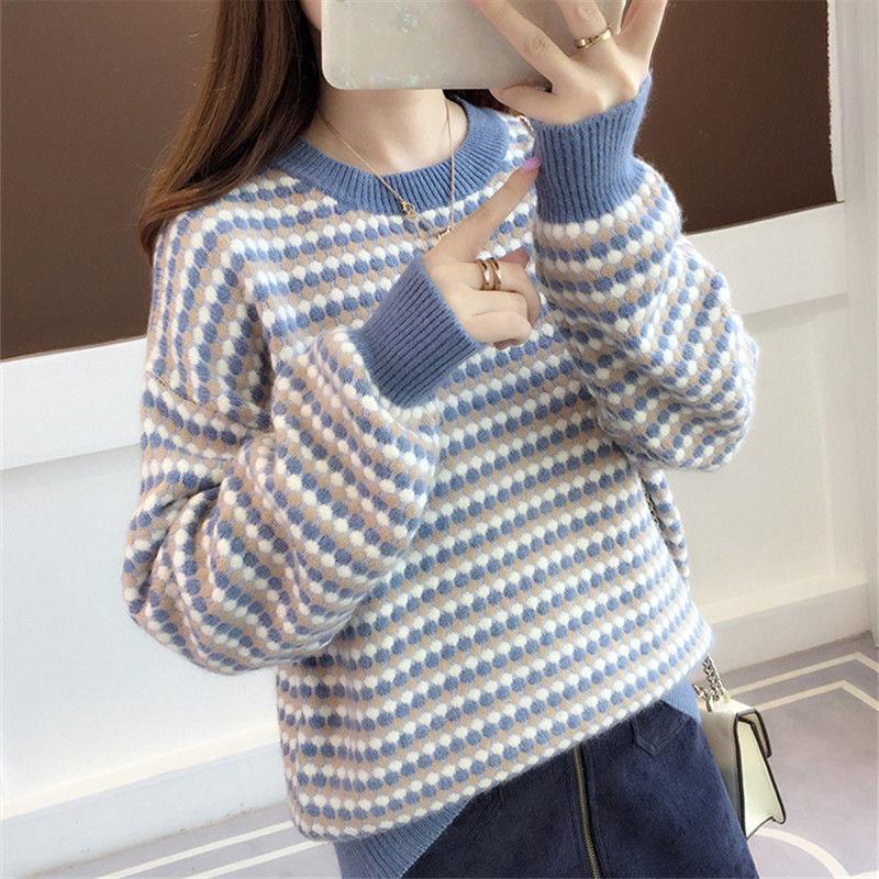 Winter striped sweater contrast women's Crew neck pullover loose Plus Size loose Knit Sweater warm