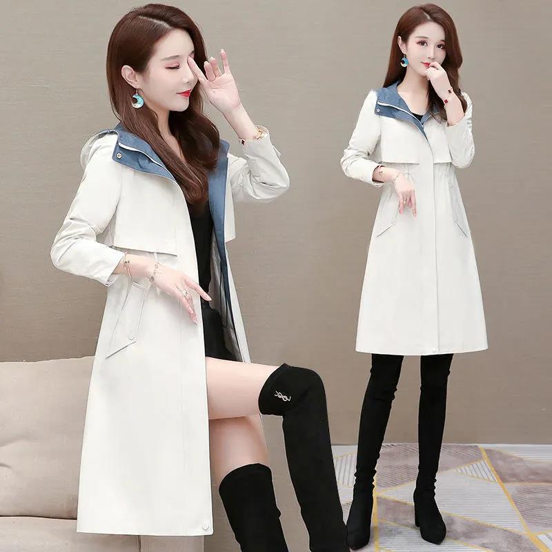 Women Boutique Slim Jacket Spring & Fall Hooded Coat Solid Color Casual Windbreaker Tight Waist Parka Long