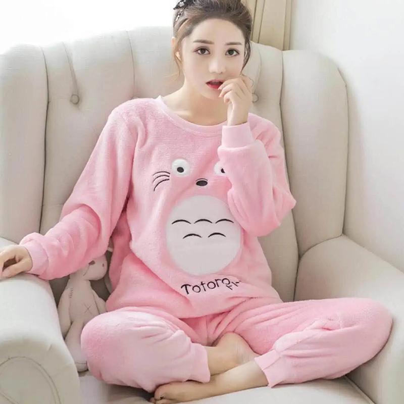 Women's Coral Fleece Pajamas Set Thickened Warm Cute Cartoon Long-sleeves Flannel House Wear Suit Comfortable Loose Sleepwear