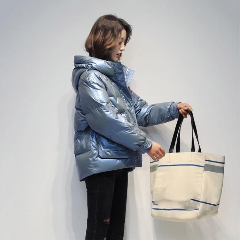 Women's Shiny Short Down Jacket Winter Korean Style Loose Quilted Jacket Casual Hooded Padded Jacket