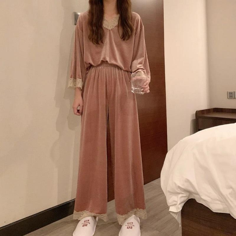 Women's Spring Autumn Lace Long-sleeved Pajamas Suit Winter Velvet Sexy Pyjamas Loose Comfortable Skin-friendly Homewear Breathable Sleeping Suit