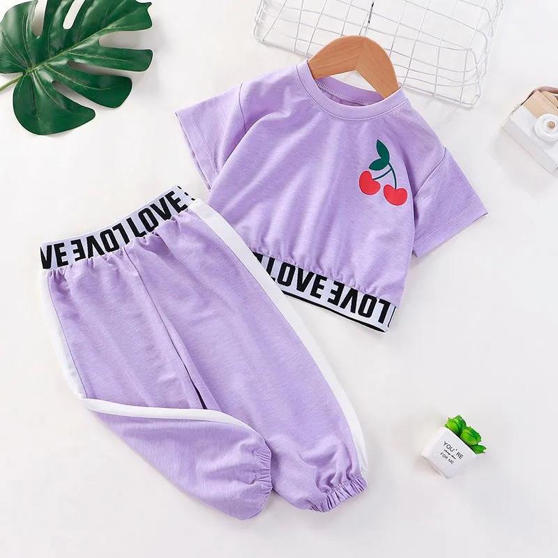 2PCS Children Clothing Set Spring Summer Girls Suits Printing Letter Cherry Short Sleeve Tops + Pants Clothing Set