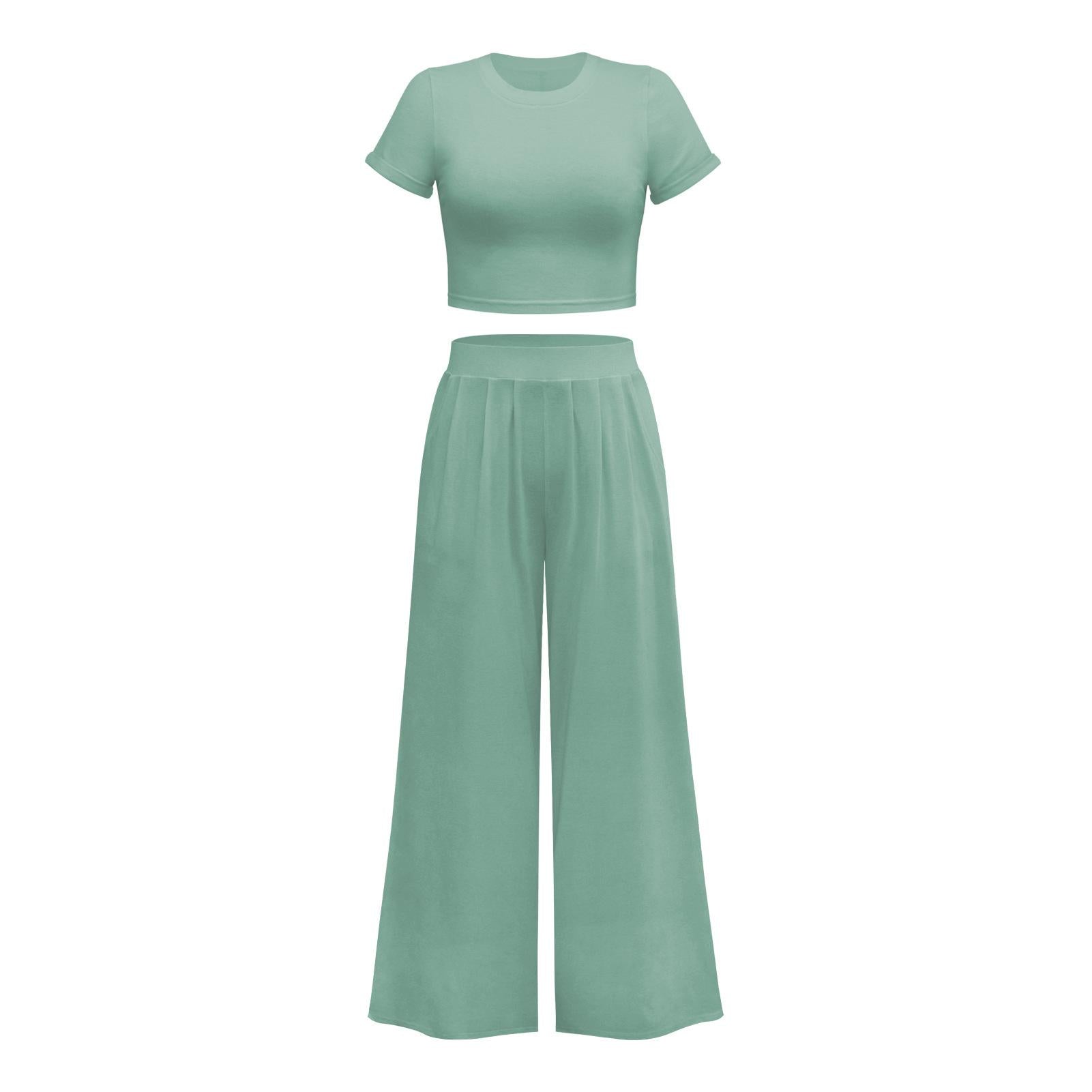 2PCS Solid Color Home Women's Short Short-sleeved T-shirt + Wide-leg Mopping Pants Suit Casual Two-piece Set Ladies Vest Trousers Suit
