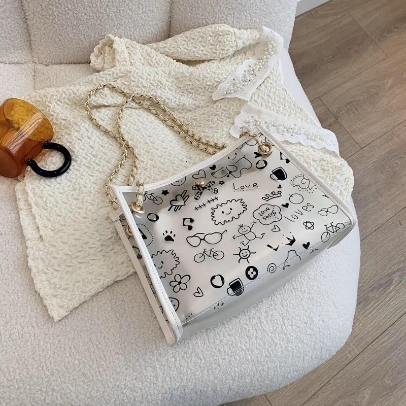 2pcs Women Clear Handbag Waterproof for Bathing Swimming Beach Metal Chain Portable Shoulder Transparent Bag