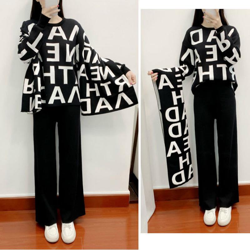 3pcs/set Knit Suit Women's Causul Letters Printed Knitted Sweater + Scarf+Knitted Pants 3 Piece Set Ladies Outfits Autumn Spring