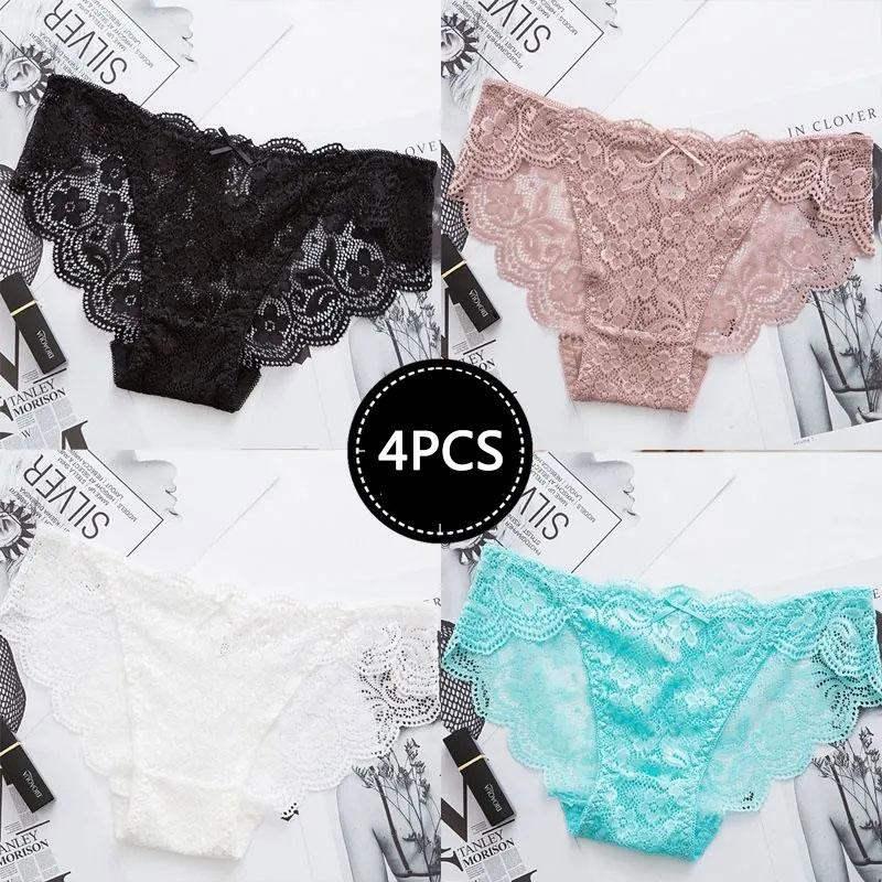 4PCS Ladies Lace Panties Sexy Charming Hollow Low Waist Briefs Seamless Cotton Crotch Girls Triangle Shorts Transparent Underwear