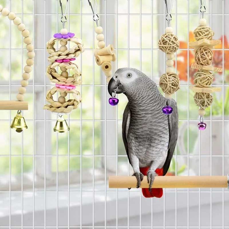8 Pieces of Parrot Toy Swing Primary Color Wood Gnawing Molar Toy Bird Cage Pendant Supplies Climbing Ladder Rattan Ball