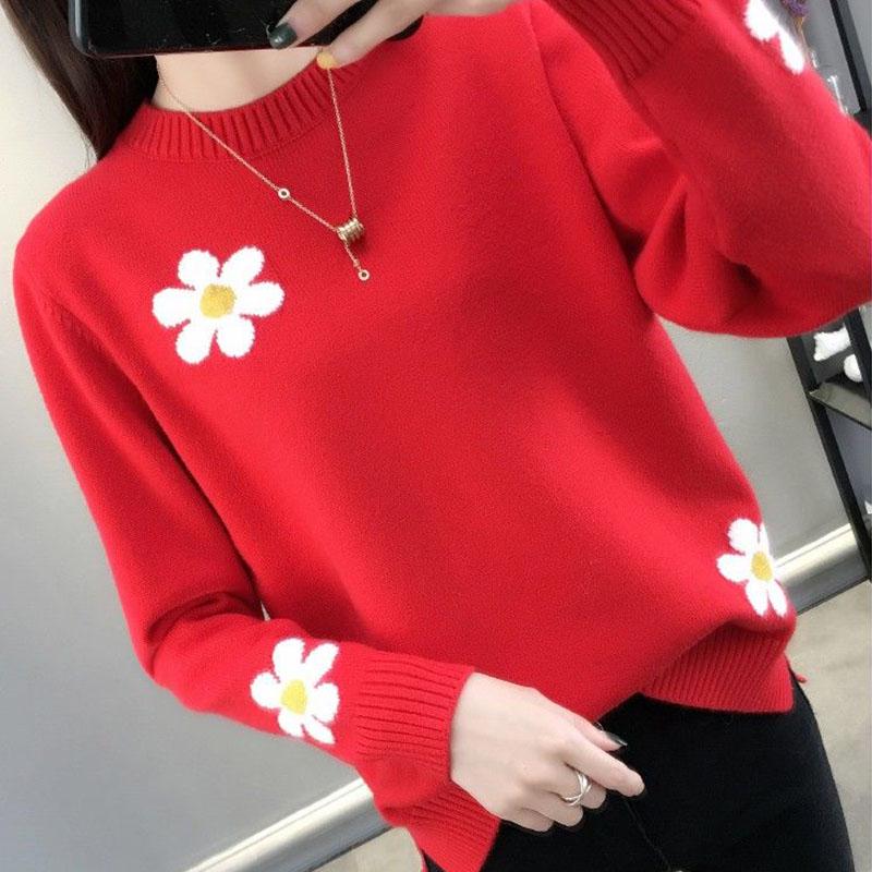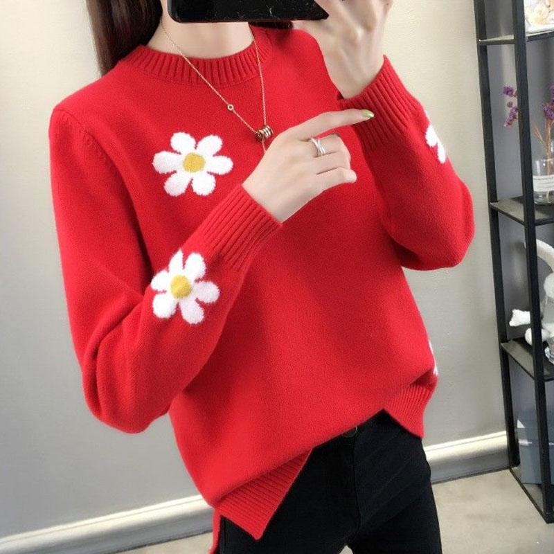 Autumn and Winter Round Neck Sweater Fashion Slim Bottoming Shirt Flower Pattern Simple Blouse