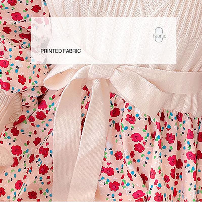 Autumn Winter Corduroy Dress Women's Knitted Stitching Long-sleeved Long Floral Dress Sweet A-line Dress with Belt