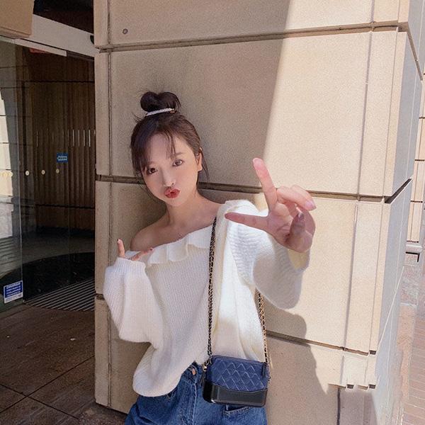 BF Wind Off-shoulder Lantern Sleeve Top with A Neckline Goddess Pure Color Sweater Autumn