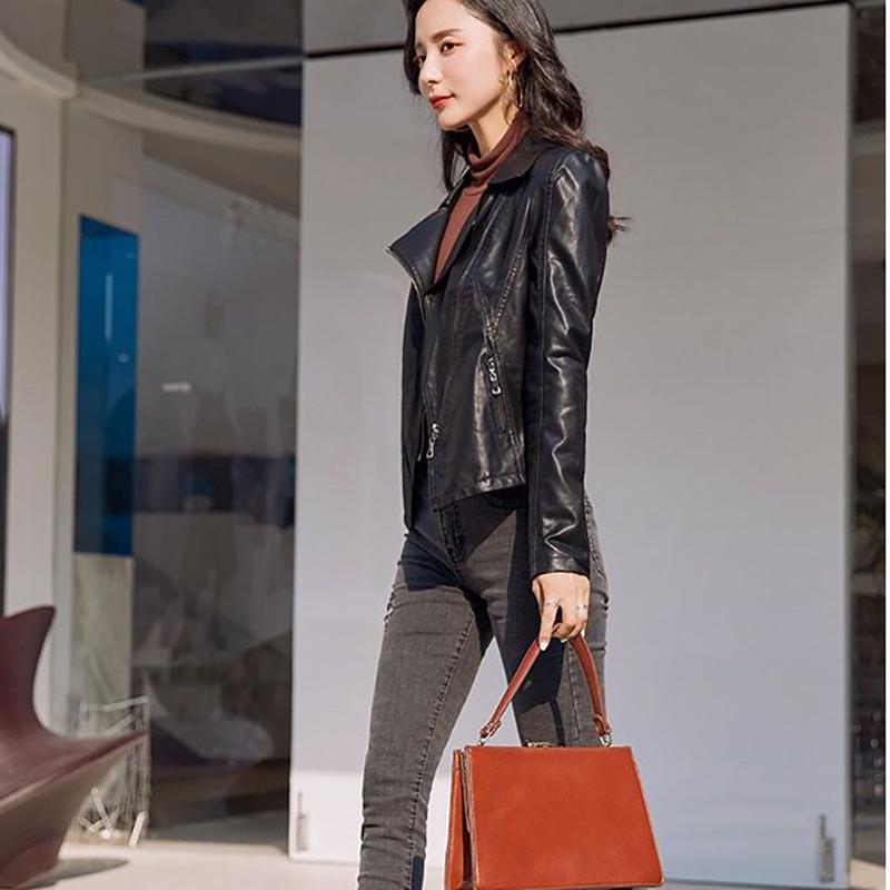Black Female Leather Jacket Spring and Autumn Slim Slimming Short Lapel All-match PU Leather Jacket