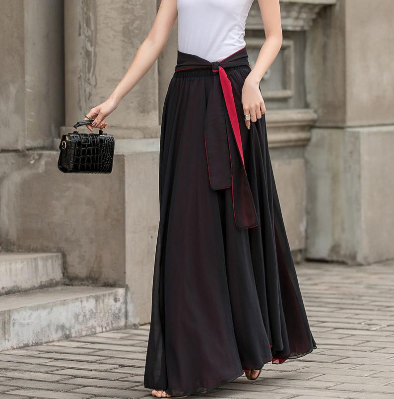 Black Long Chiffon Maxi Skirt Women, Swing Full Circle Skirt, Boho Maxi Skirt, Elastic Waist Chiffon Skirt with Sash, Plus Size Skirt