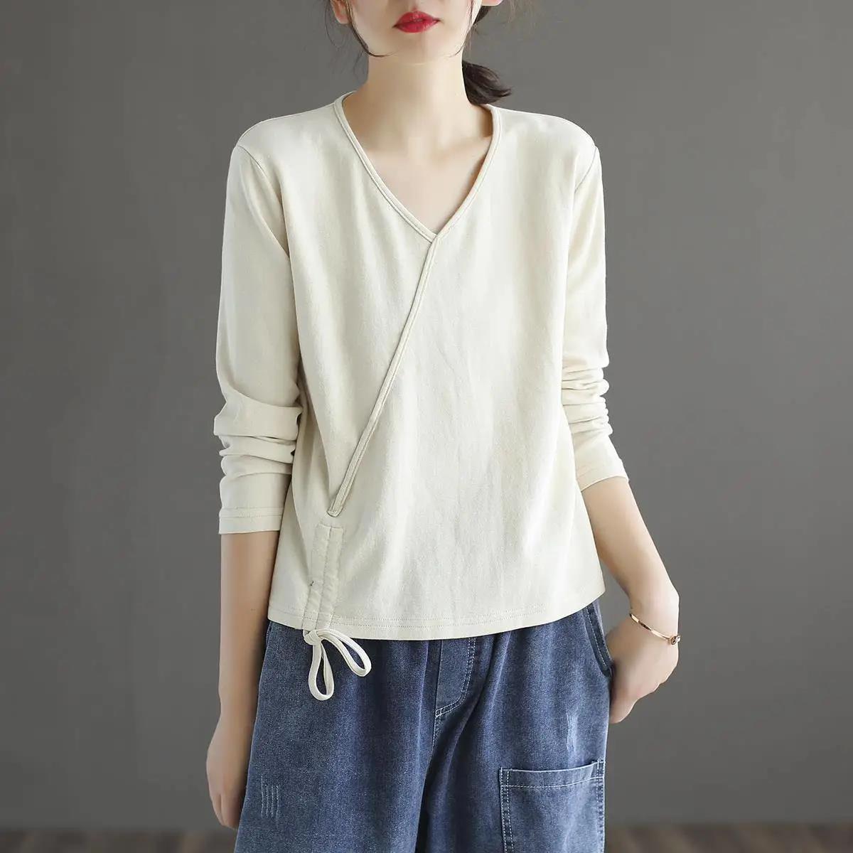 Cotton Solid Color V-Neck T-Shirt Ladies Spring Autumn Hem Drawstring Loose Casual Long Sleeve Retro Top