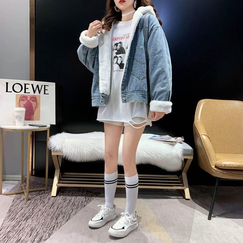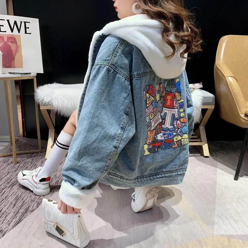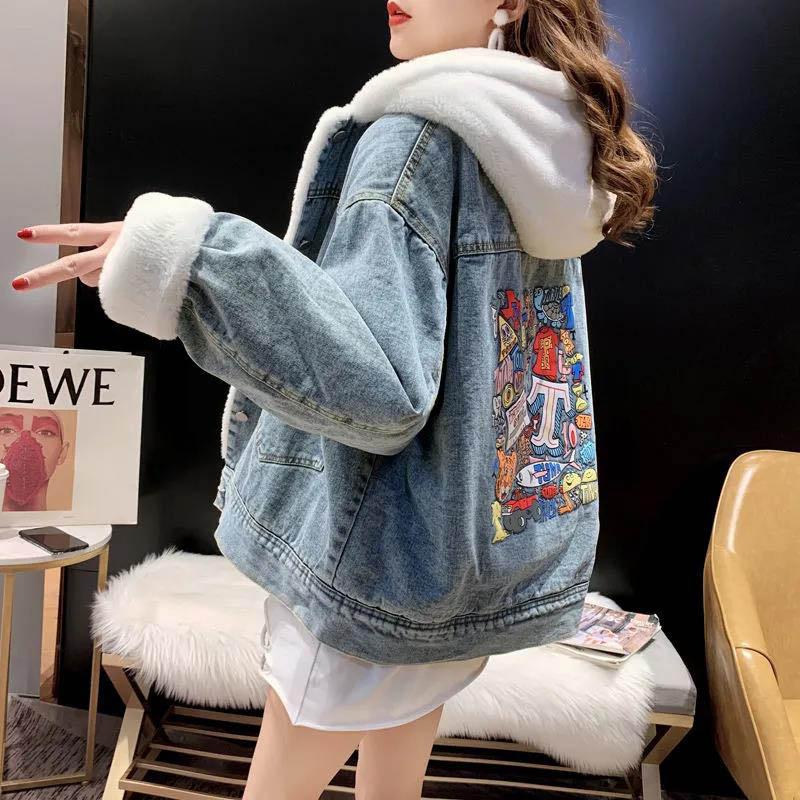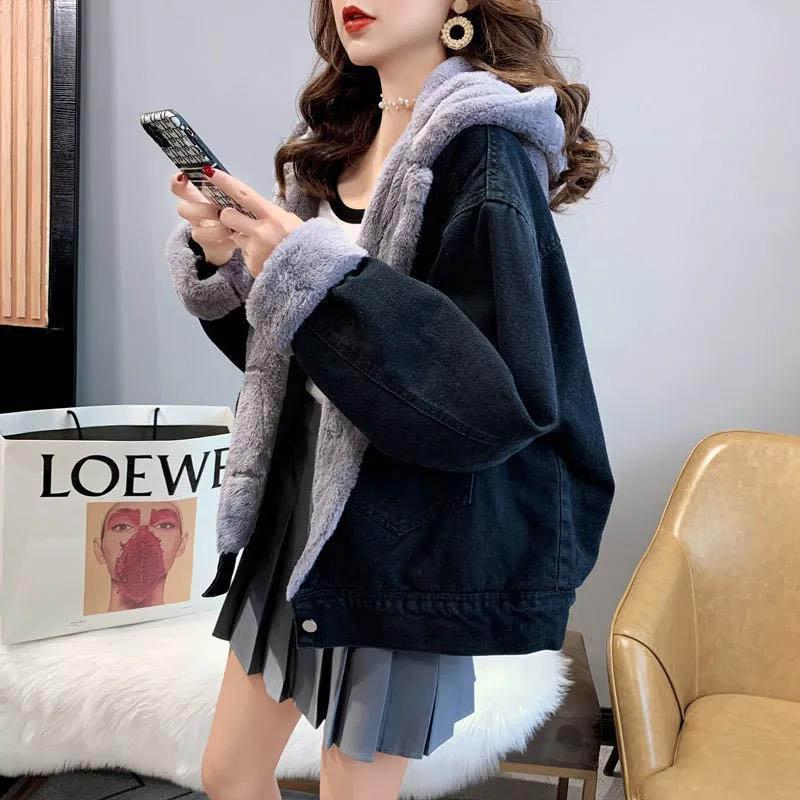 Denim and Lamb Velvet Stitching Jacket Women Plus Velvet Thick Loose Loose Style Autumn and Winter Cardigan All-match