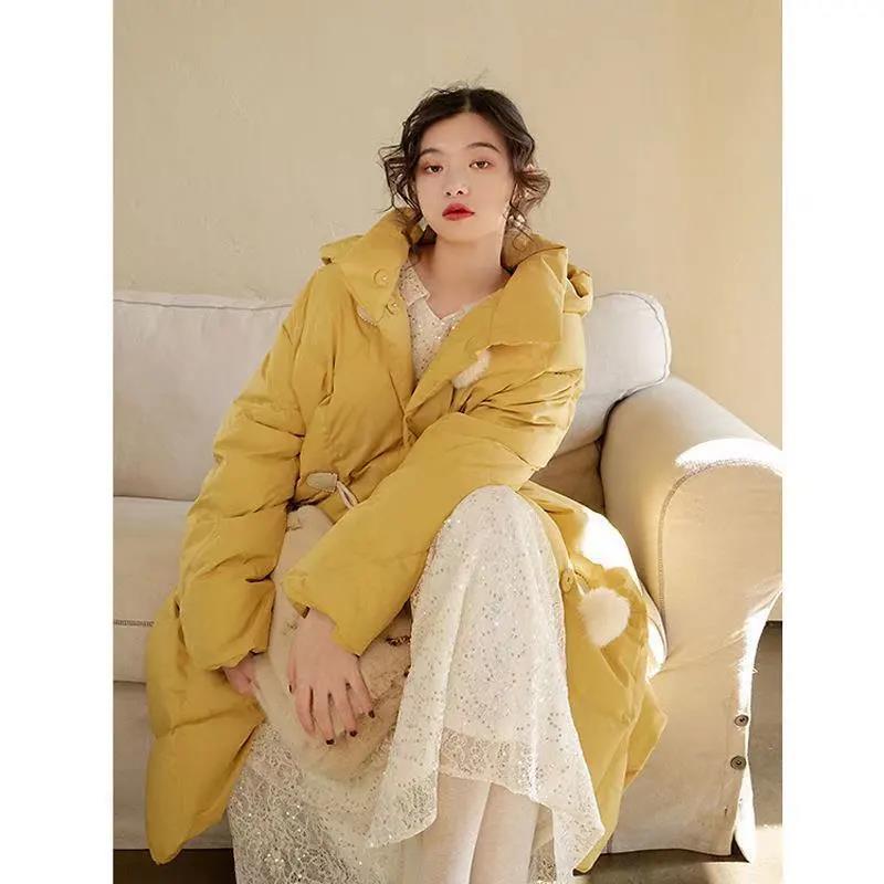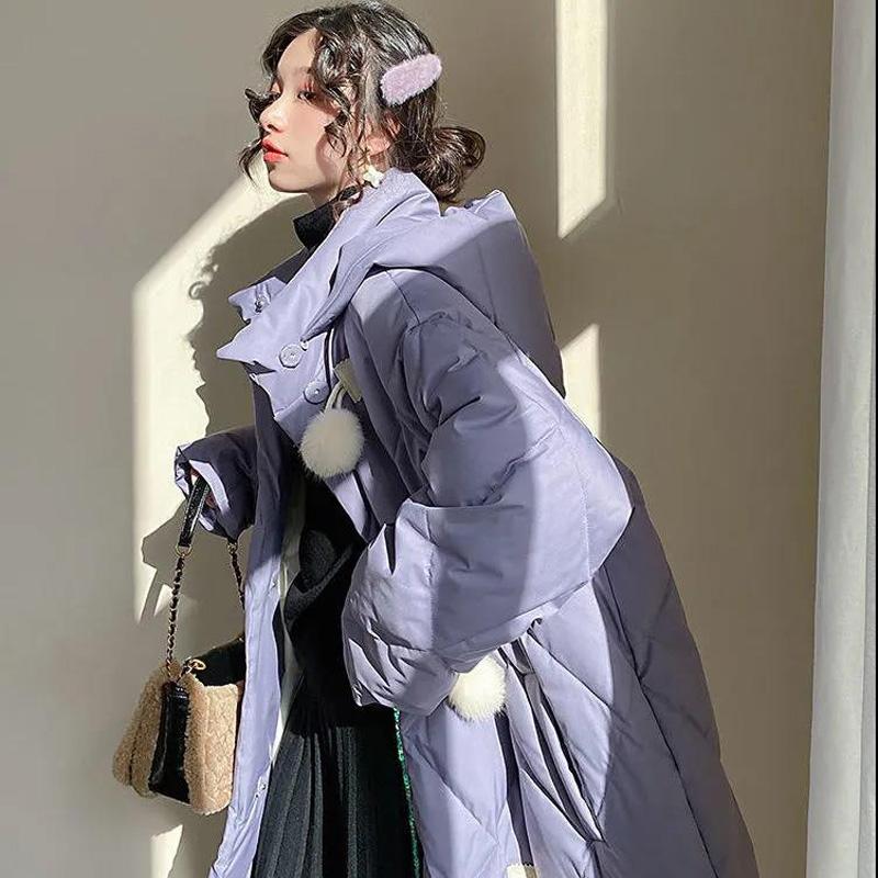 Duck Down Retro Diamond Lattice Horn Buckle Real Hair Ball Cute Down Jacket Mid-length Hooded Loose Warm Jacket Women